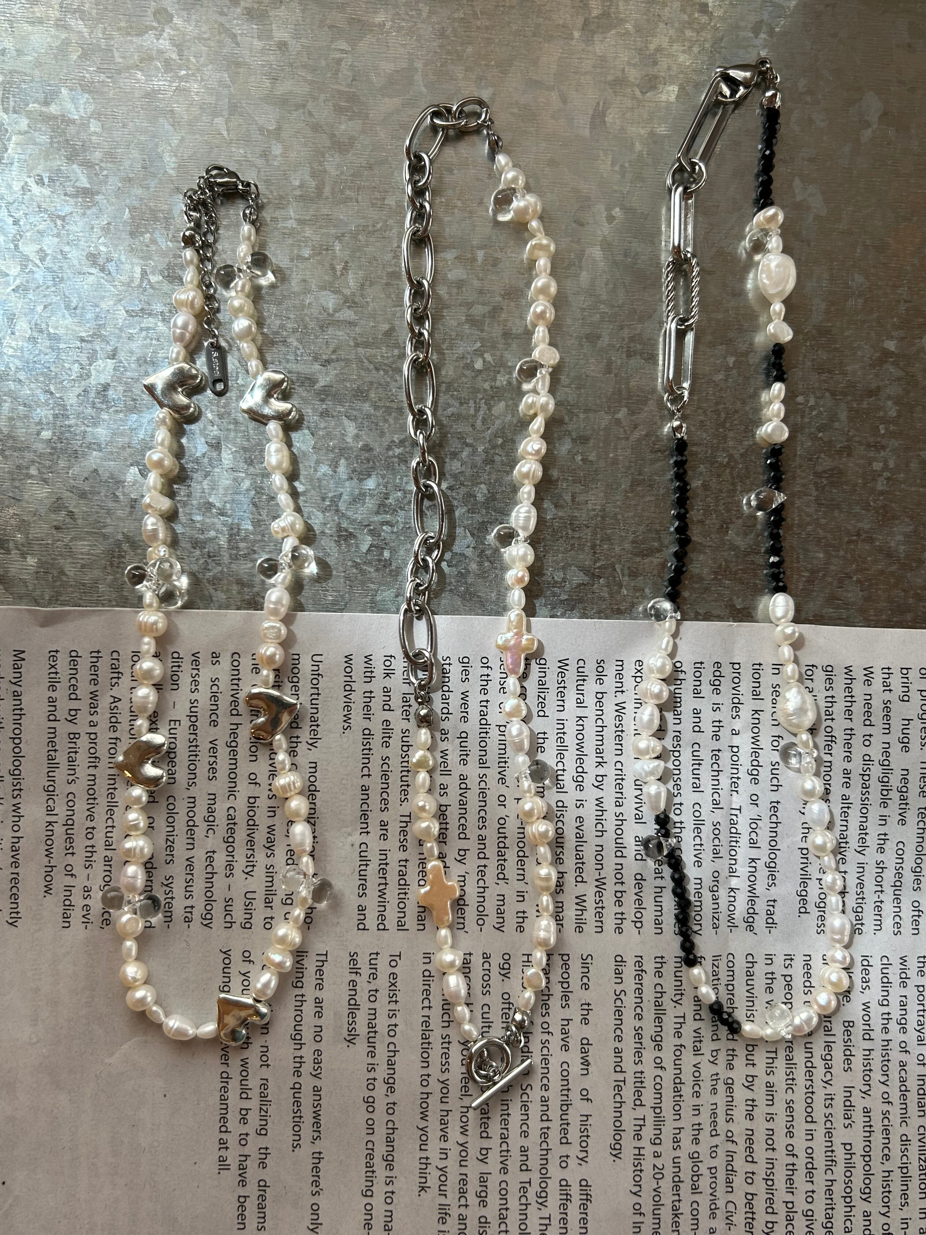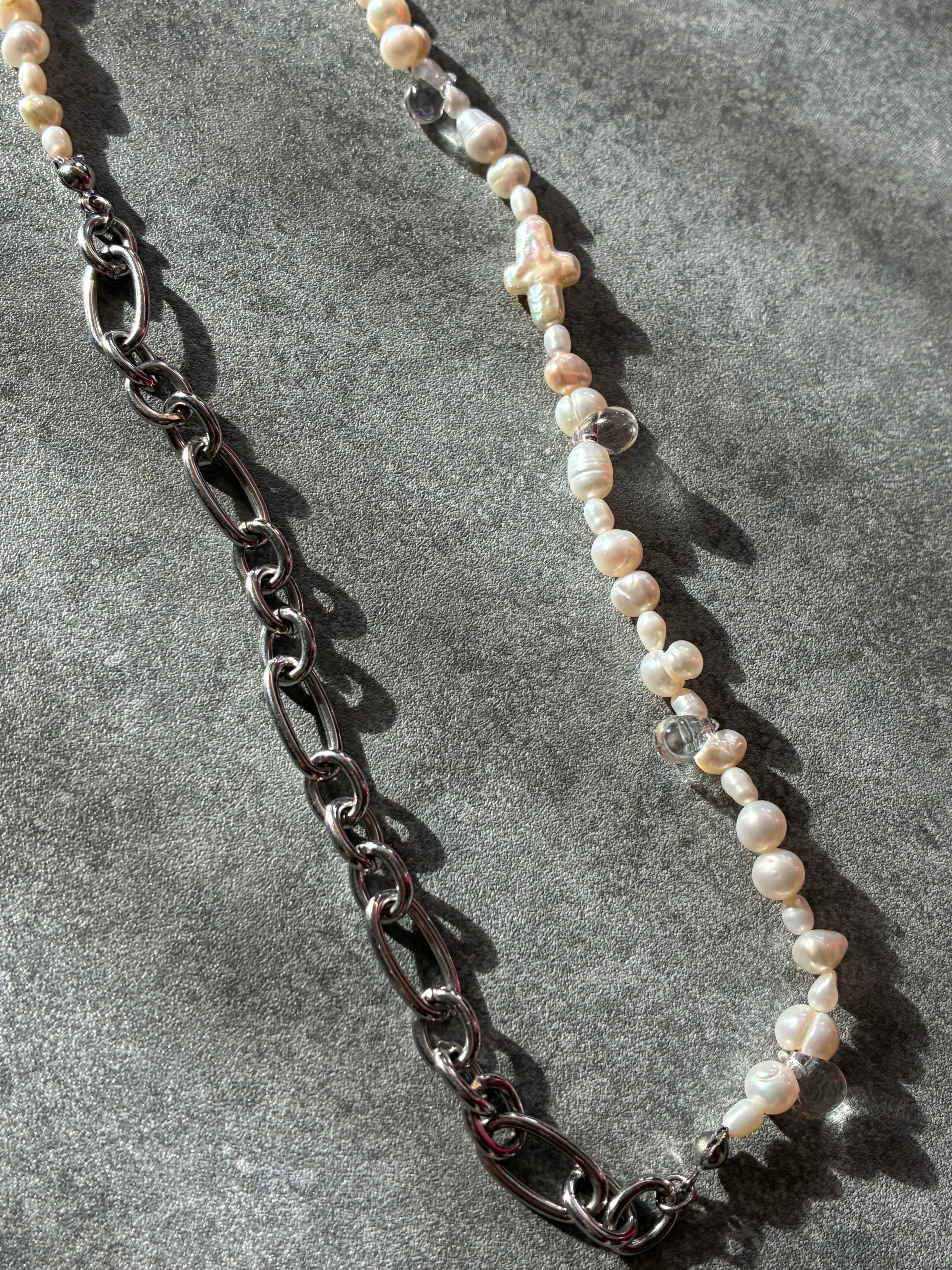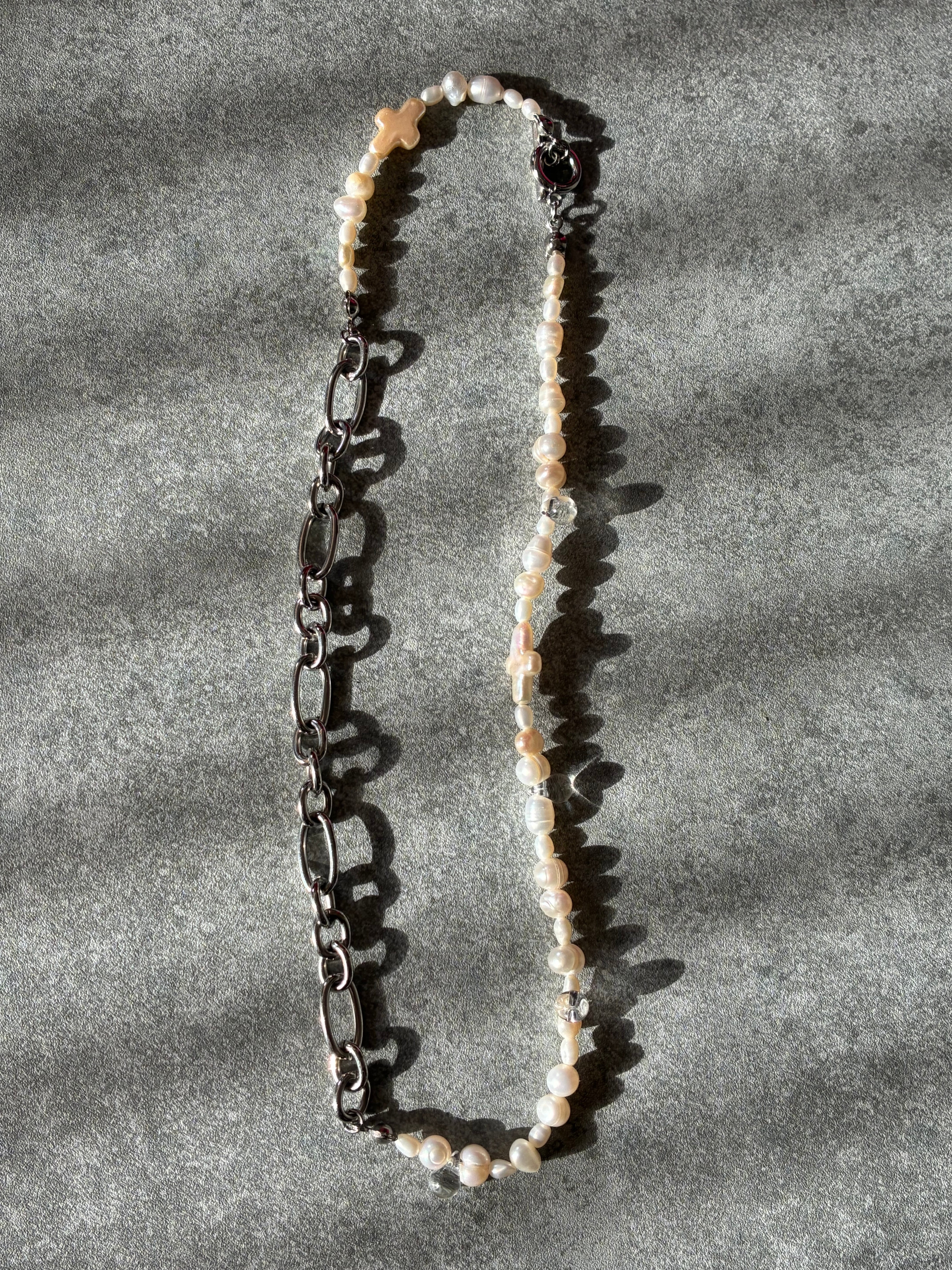ステンレスチェーンの無機質な強さを組み合わせたネックレス。